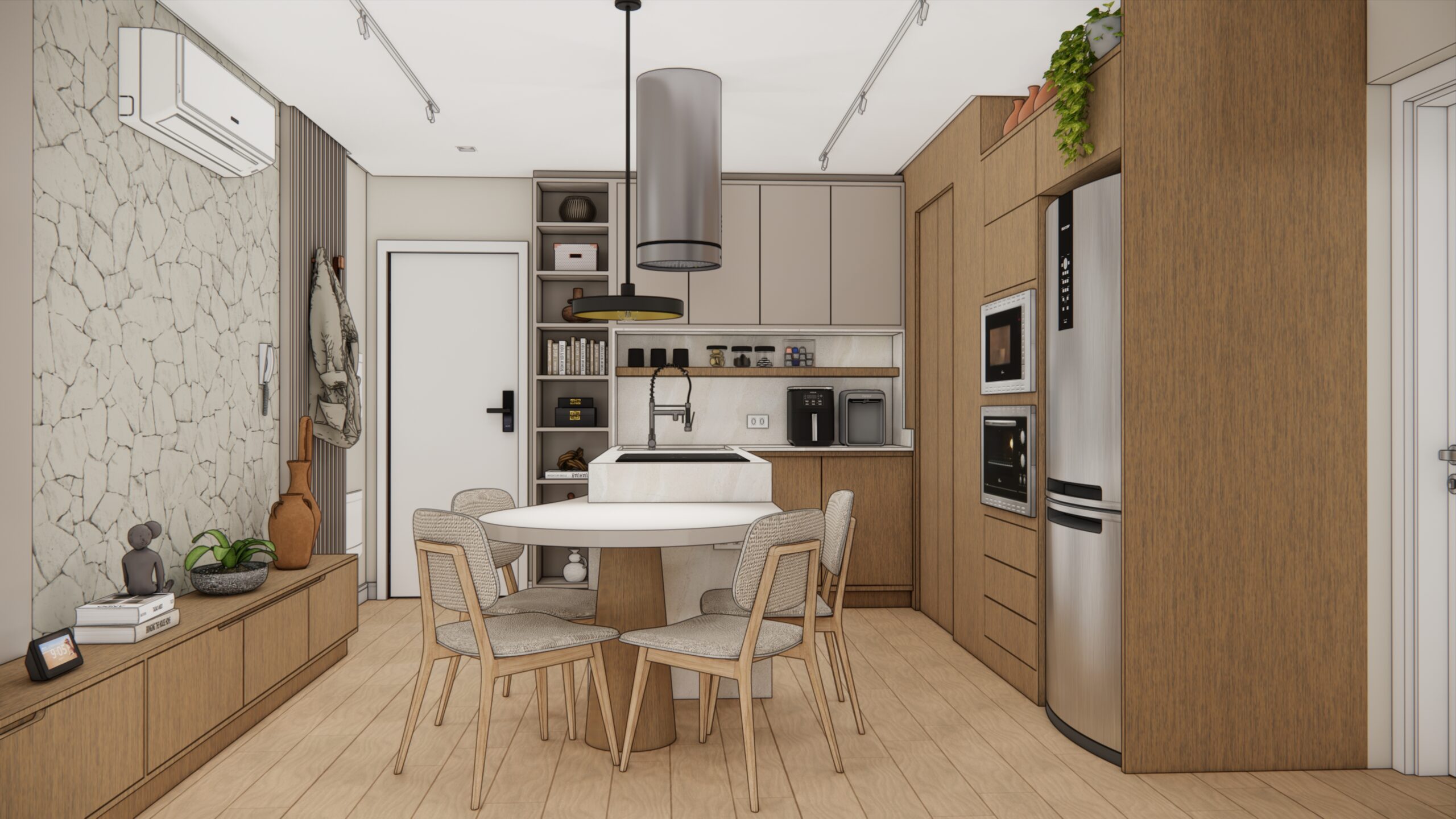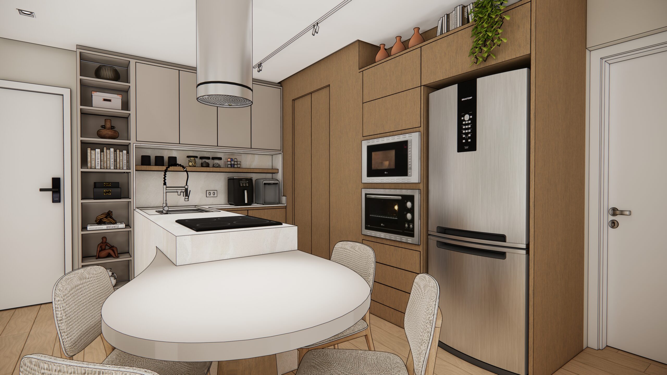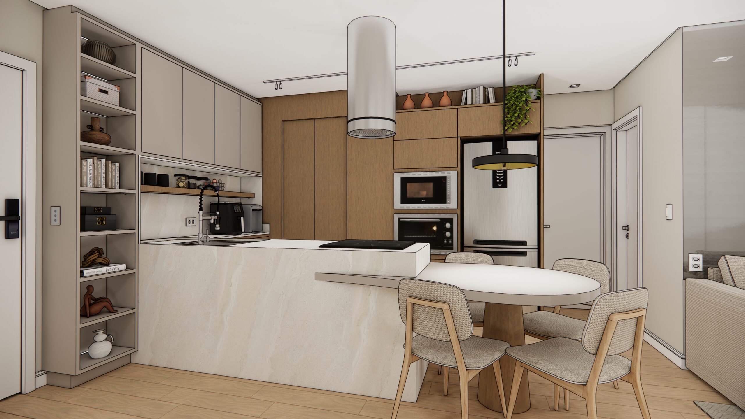 Por volta de 50 metros quadrados, este apartamento foi projetado para oferecer conforto, sofisticação e praticidade em cada detalhe. A planta bem resolvida integra a sala de estar e a cozinha num único ambiente fluido e convidativo. O destaque vai para a península em formato orgânico, que se estende com leveza até uma mesa redonda engastada, criando uma atmosfera perfeita para refeições acolhedoras e momentos de convivência.
