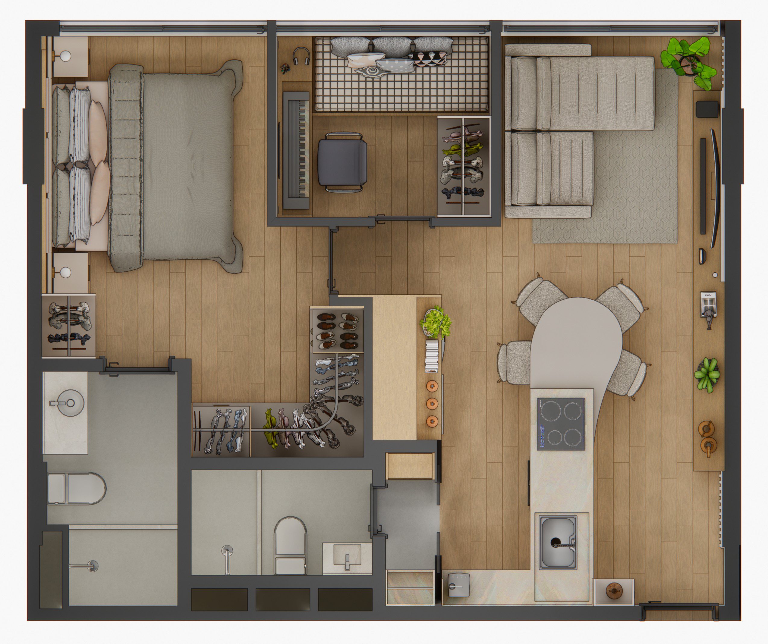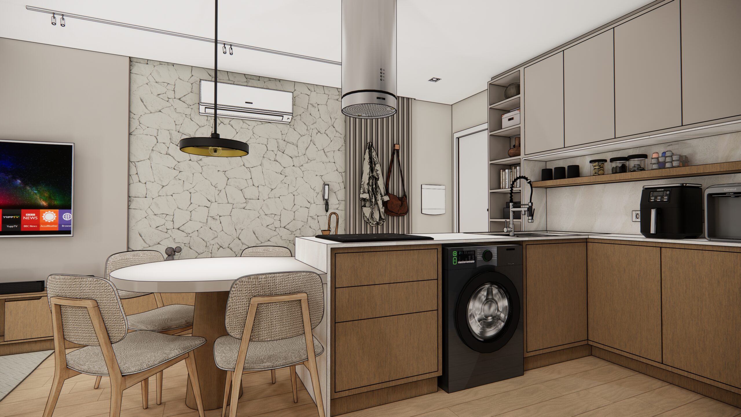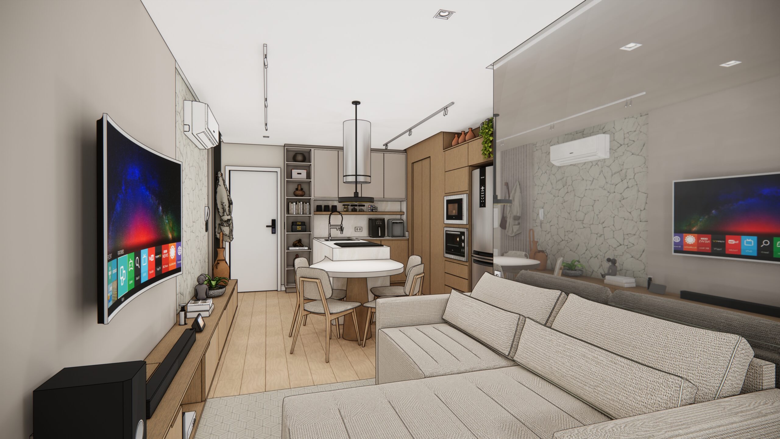 Por volta de 50 metros quadrados, este apartamento foi projetado para oferecer conforto, sofisticação e praticidade em cada detalhe. A planta bem resolvida integra a sala de estar e a cozinha num único ambiente fluido e convidativo. O destaque vai para a península em formato orgânico, que se estende com leveza até uma mesa redonda engastada, criando uma atmosfera perfeita para refeições acolhedoras e momentos de convivência.