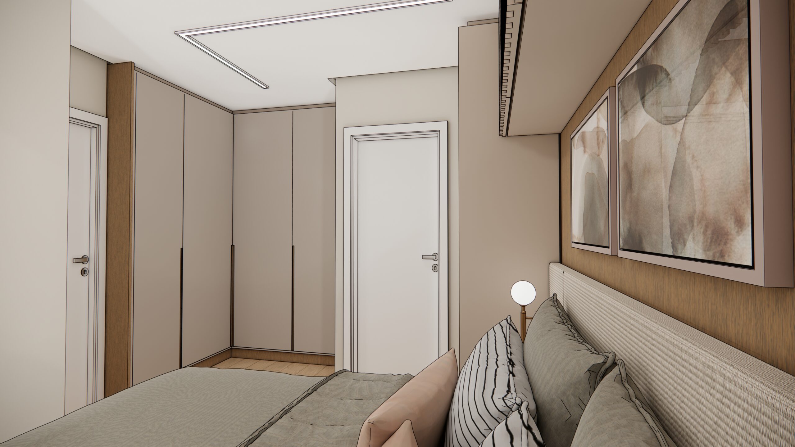 Nos acabamentos, a escolha pelo piso vinílico amadeirado confere aconchego e unidade visual ao espaço, exceto nos banheiros, onde foi mantido o revestimento original da construtora, respeitando as características técnicas desses ambientes. As paredes em tom Papel Picado reforçam a leveza do projeto, enquanto a marcenaria combina o calor do frejó puro da Duratex com a suavidade do nude connect da Arauco.
