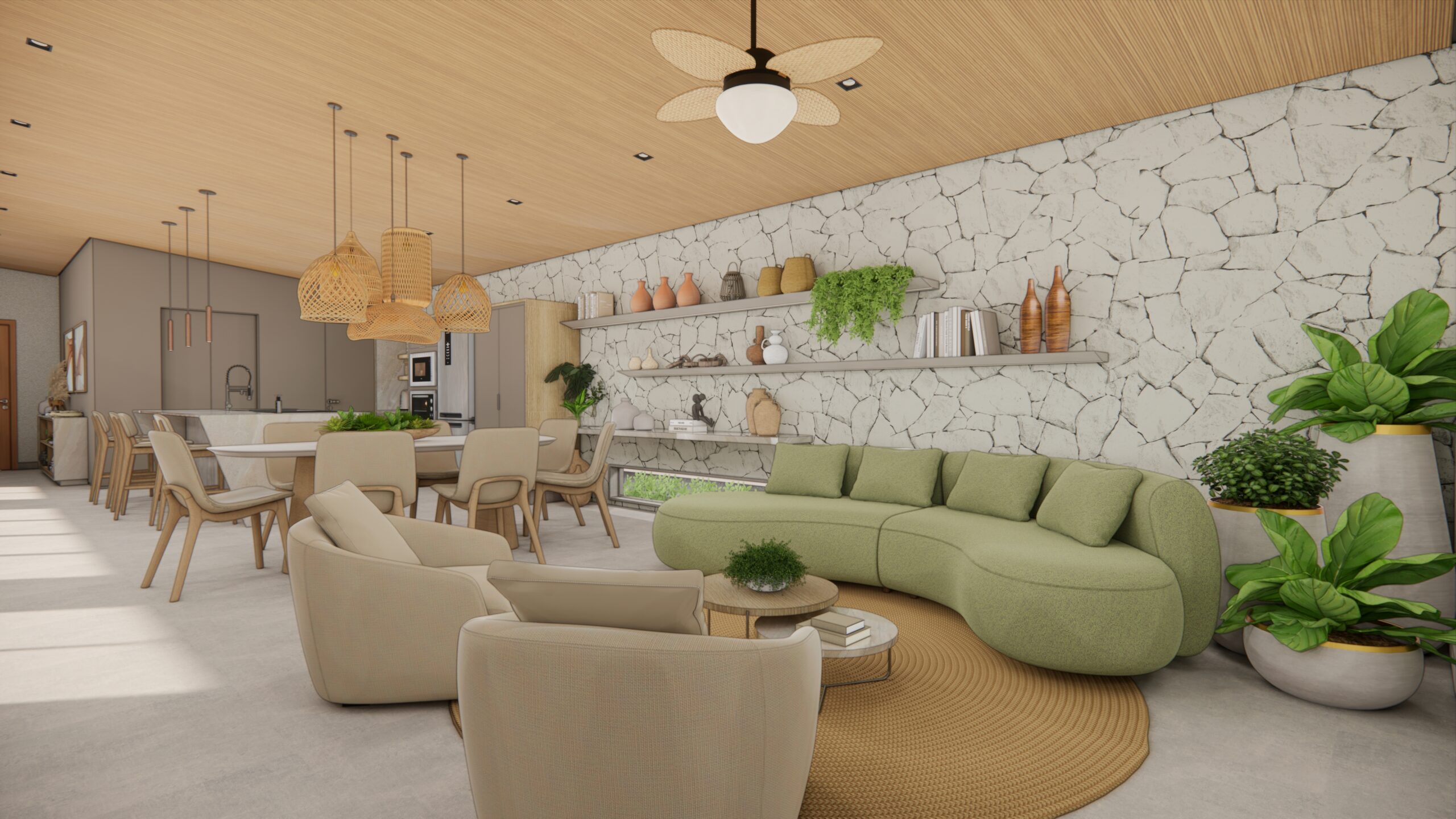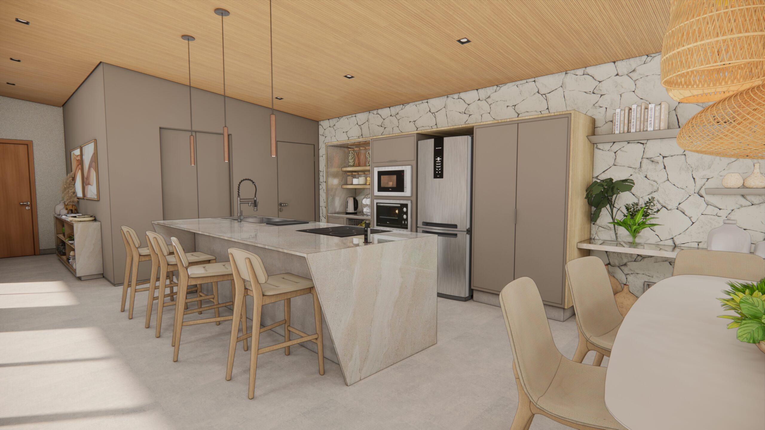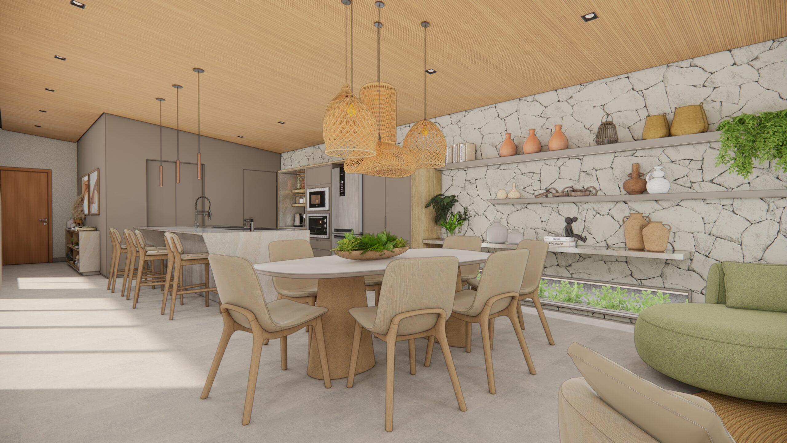 Assinado por um time que valoriza o conforto e a estética natural, este projeto traduz, em uma única imagem, o equilíbrio entre funcionalidade e beleza. A proposta parte da integração perfeita entre sala de estar, jantar e cozinha, onde cada ambiente conversa com o outro através de uma paleta suave, formas orgânicas e materiais naturais.
