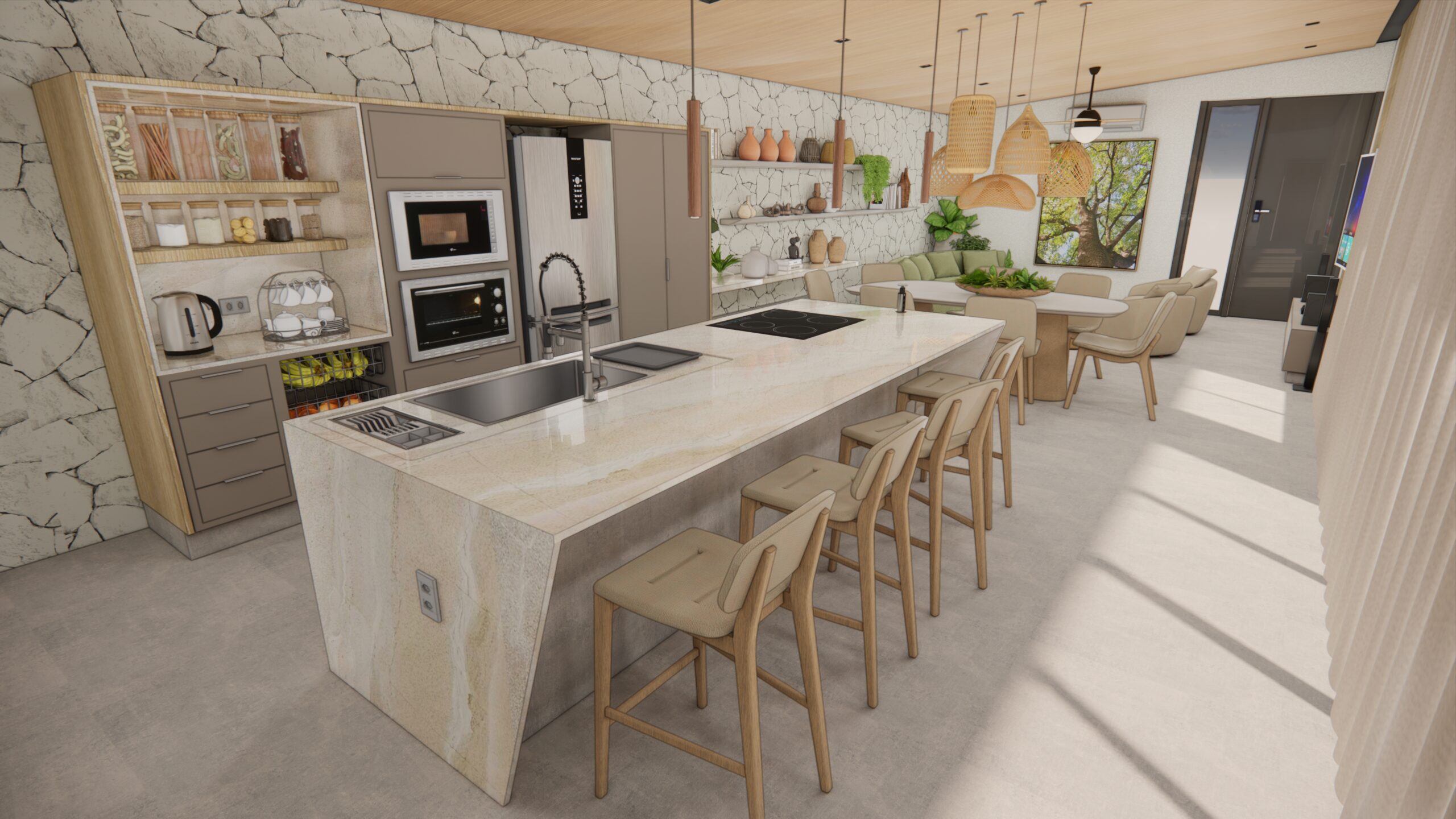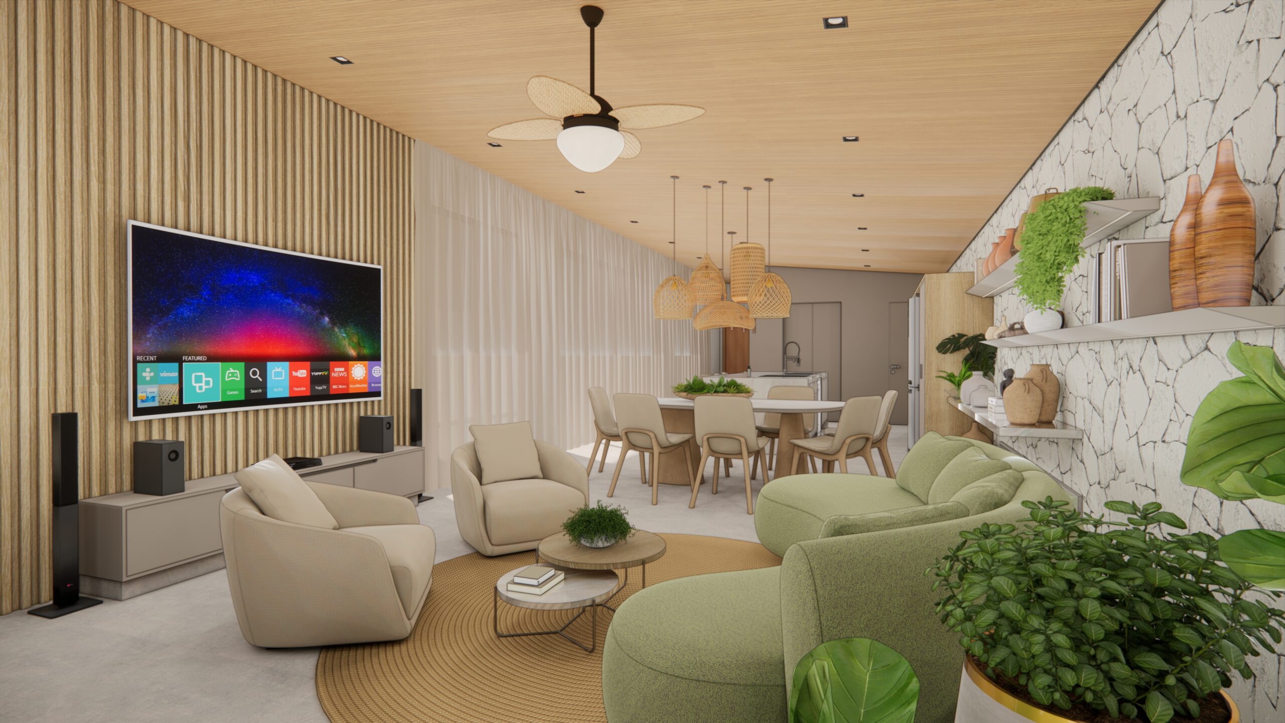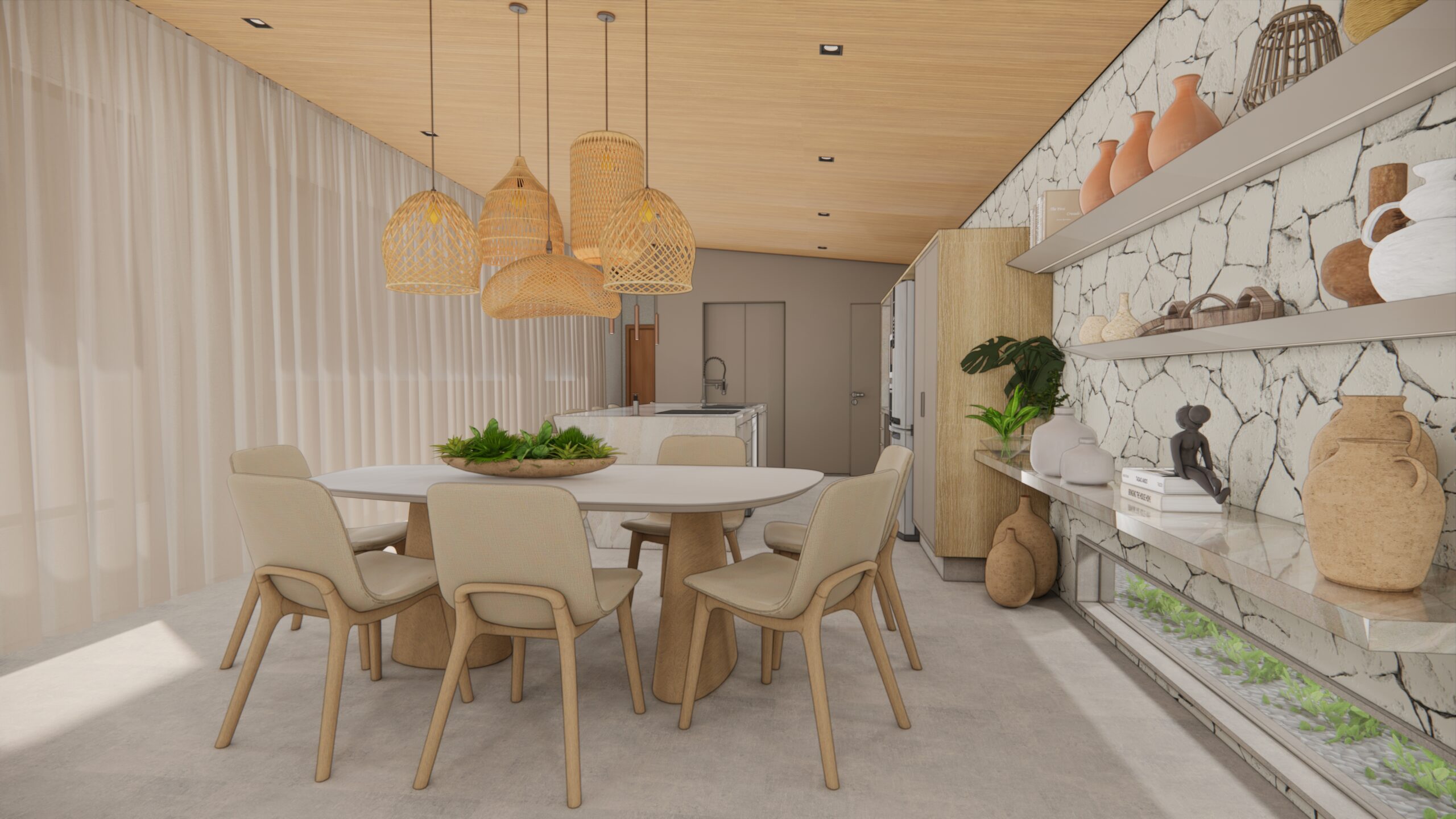 Assinado por um time que valoriza o conforto e a estética natural, este projeto traduz, em uma única imagem, o equilíbrio entre funcionalidade e beleza. A proposta parte da integração perfeita entre sala de estar, jantar e cozinha, onde cada ambiente conversa com o outro através de uma paleta suave, formas orgânicas e materiais naturais.