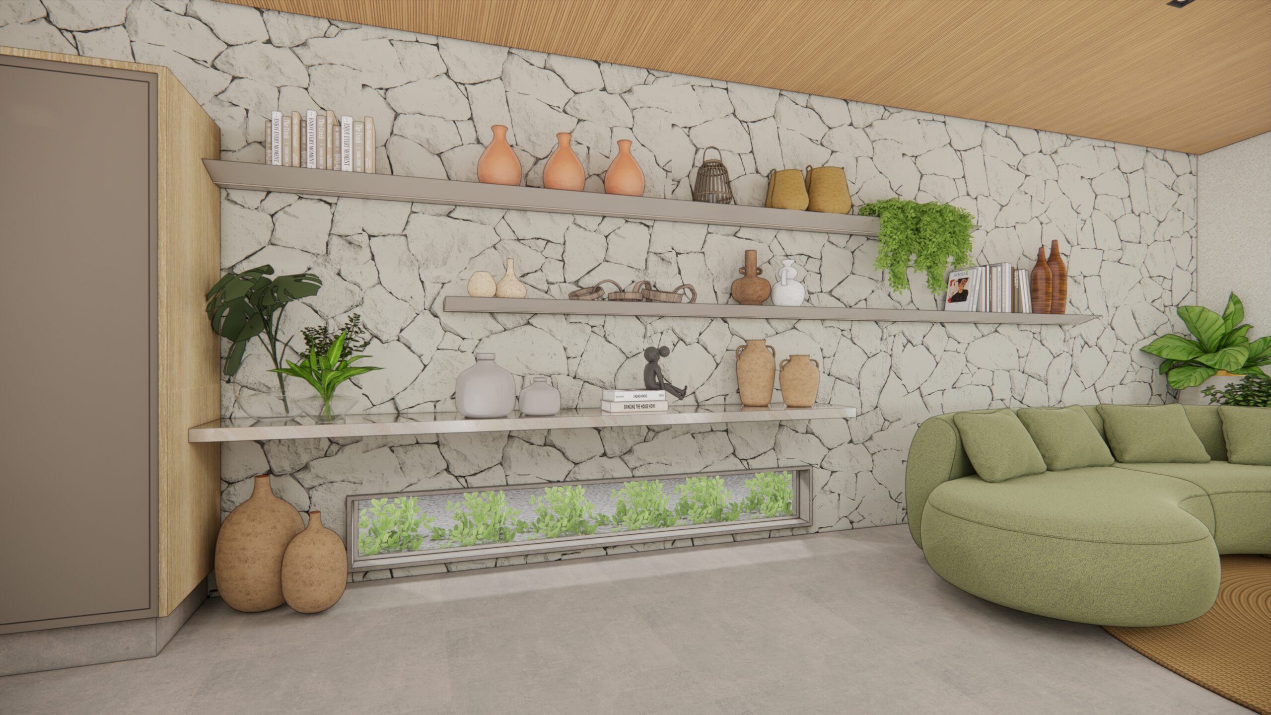 A decoração aposta na simplicidade dos elementos naturais: vasos em cerâmica, esculturas discretas, arranjos verdes e objetos artesanais dão personalidade ao espaço sem sobrecarregá-lo. As prateleiras flutuantes expõem livros e peças decorativas como se cada item contasse uma história.