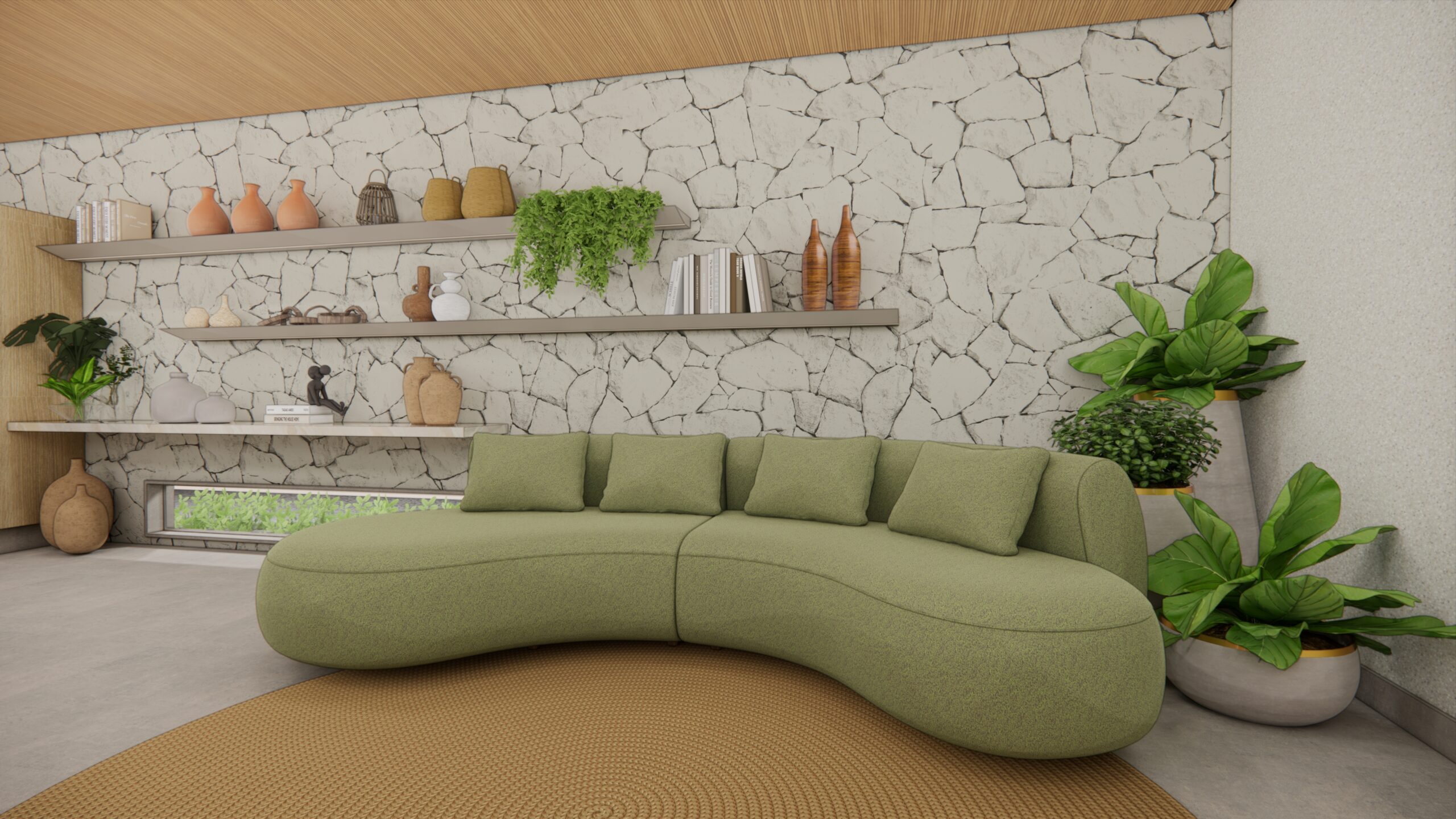 Tons de verde, areia, caramelo e terracota se combinam para criar uma atmosfera serena e convidativa. O sofá curvo em verde musgo é o protagonista da sala de estar, trazendo fluidez ao layout e reforçando o estilo orgânico. Poltronas giratórias em tom bege complementam o estar com leveza e conforto.