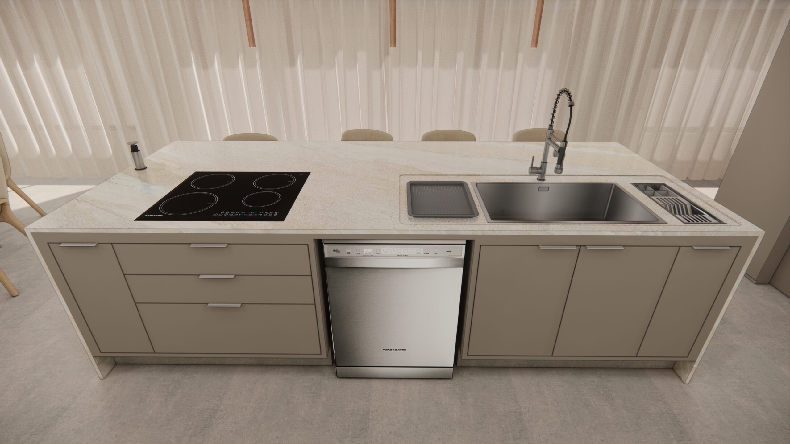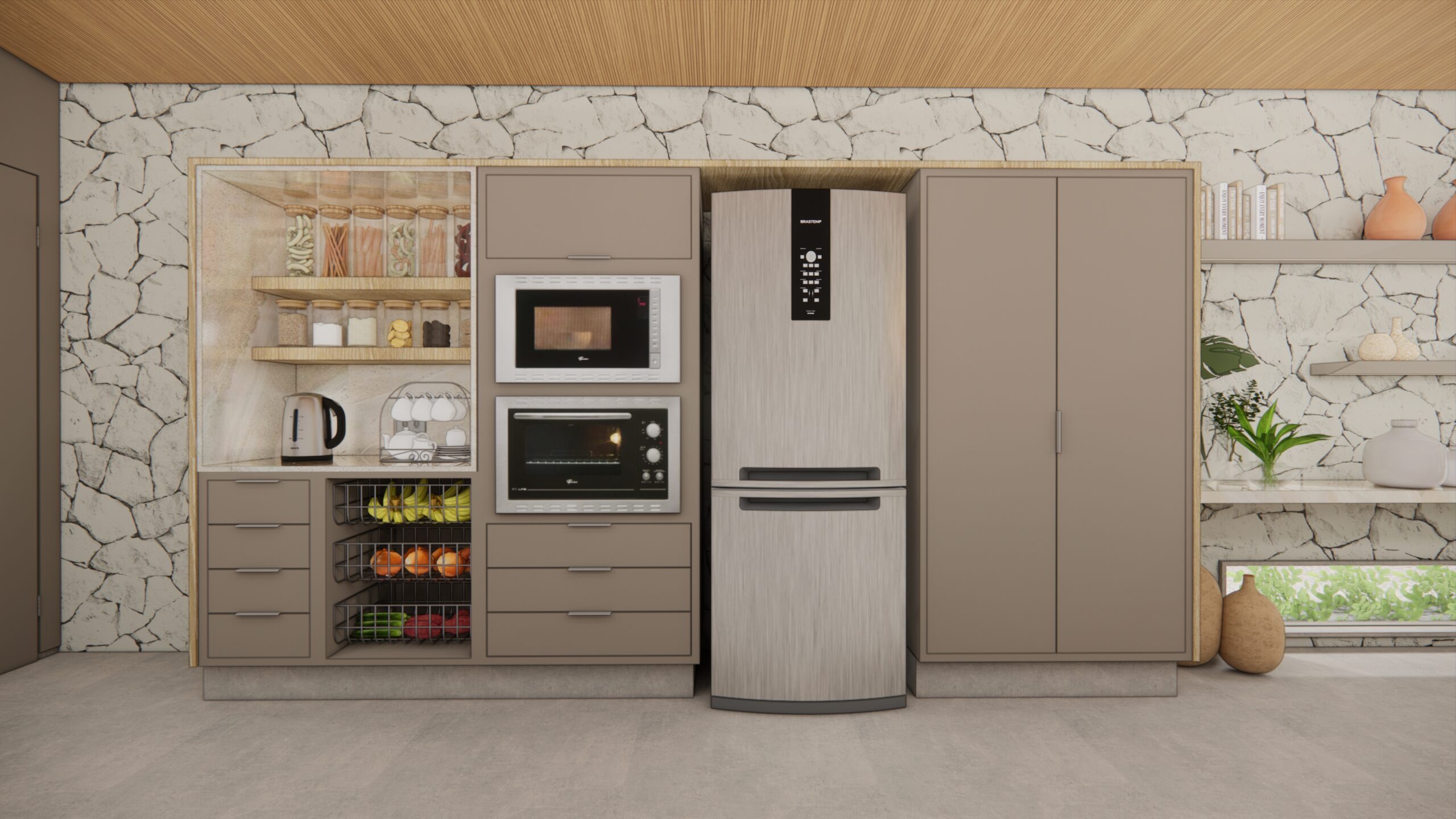 A marcenaria sob medida tem papel protagonista. Em tons de fendi, os armários da cozinha são discretos, com acabamento fosco e sem puxadores aparentes, garantindo uma estética limpa e contemporânea. O nicho funcional expõe mantimentos e eletroportáteis de maneira organizada, tornando a rotina prática sem abrir mão da elegância.