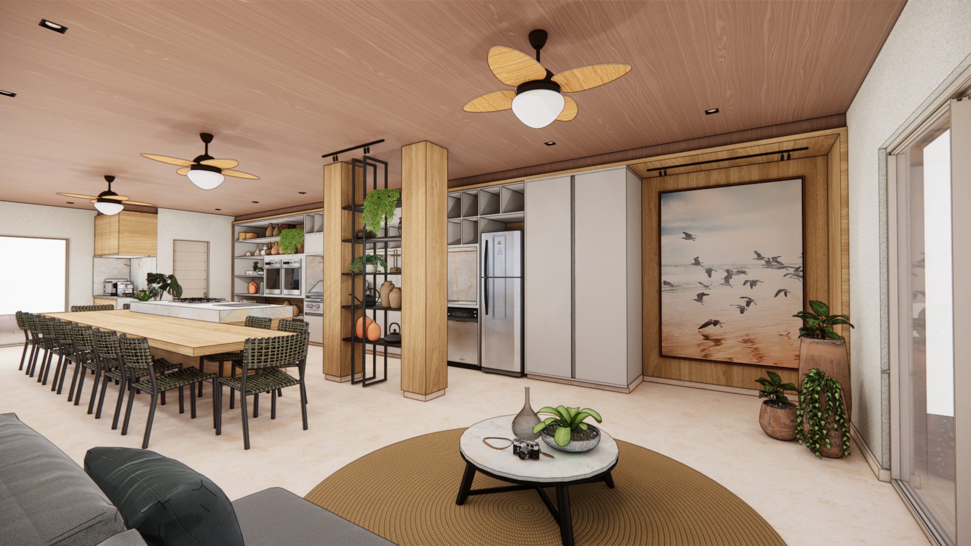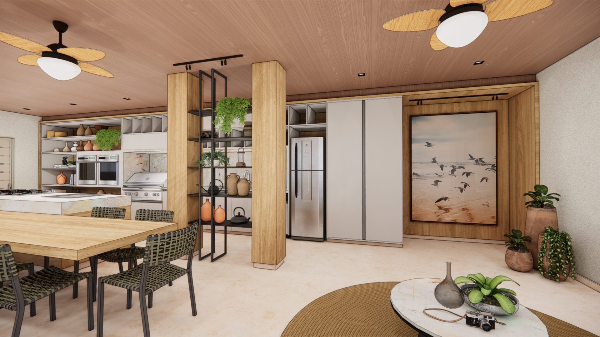 A iluminação foi projetada para criar um clima envolvente e acolhedor. Luminárias de embutir discretas garantem a iluminação geral, enquanto ventiladores com pás em madeira e luz central difusa reforçam o estilo tropical-chique da proposta. Pontos de luz estratégicos valorizam texturas, obras de arte e o painel fotográfico com moldura ripada, que adiciona charme e personalidade à composição.