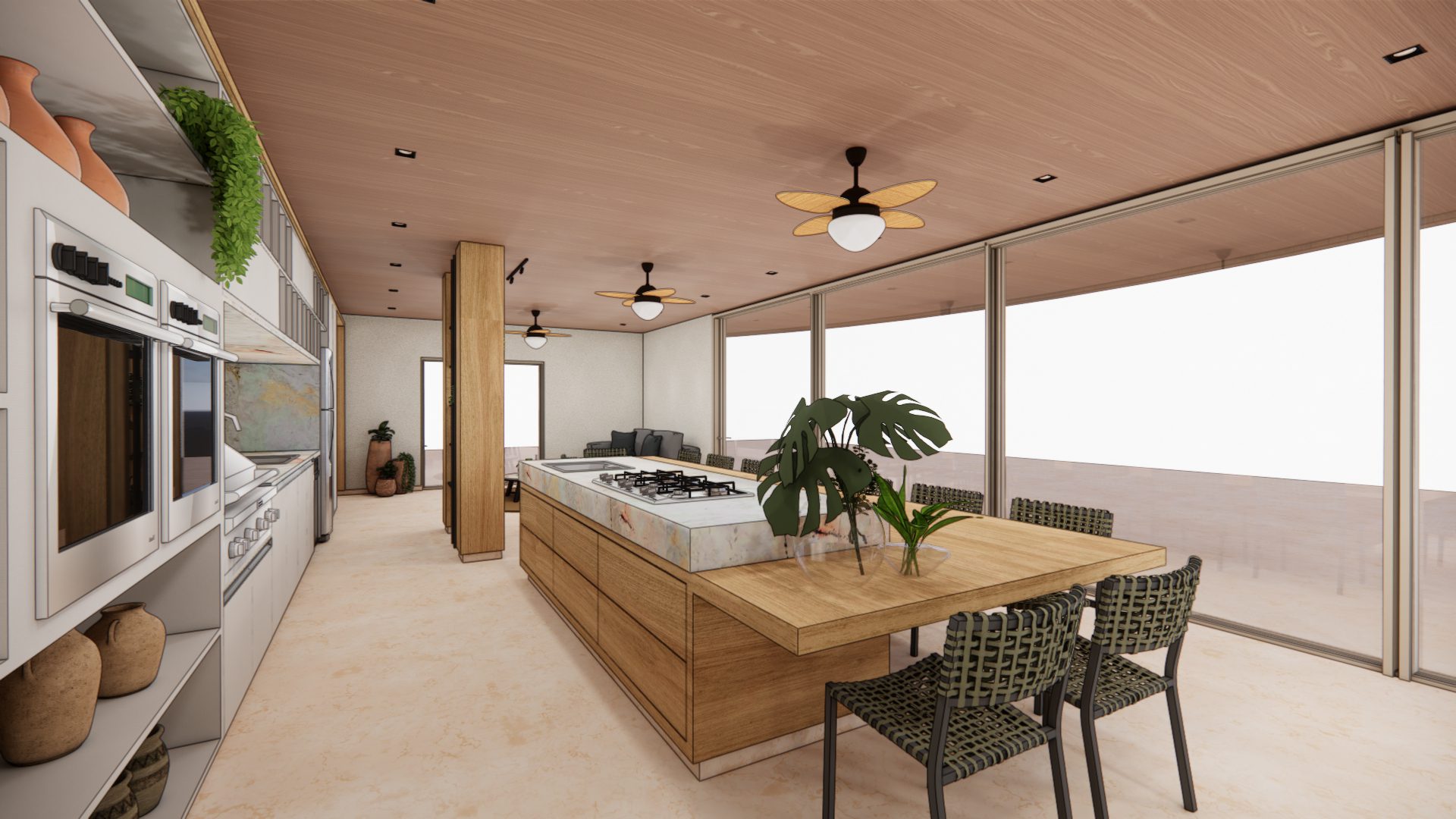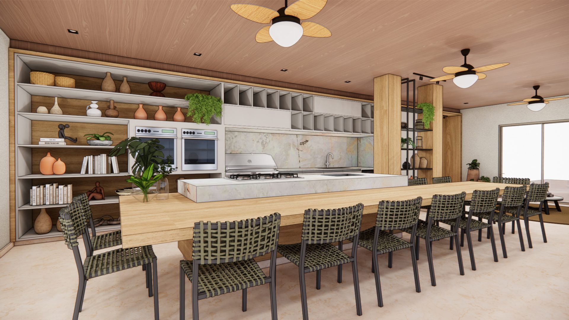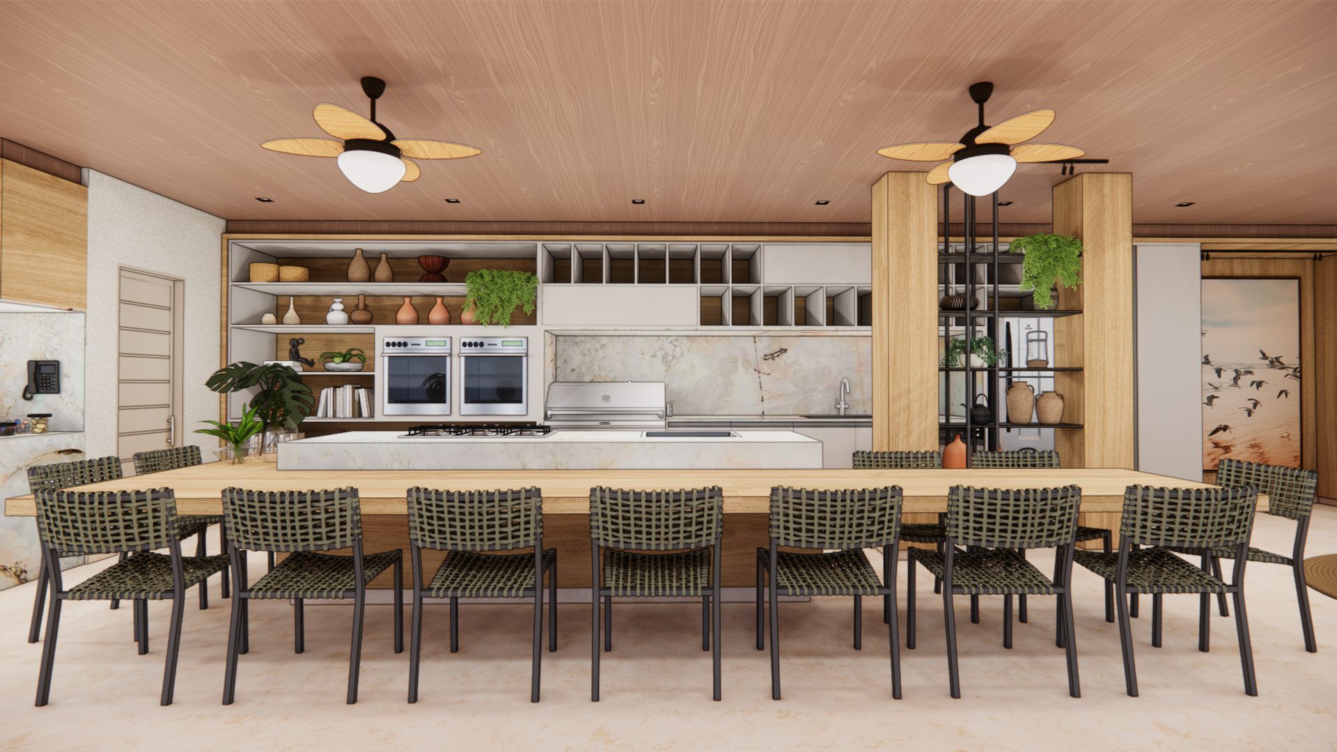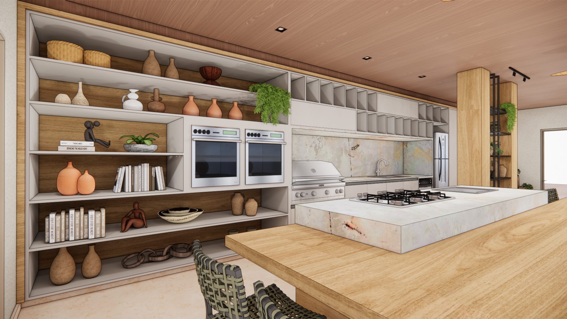 A cozinha gourmet é equipada com eletrodomésticos de última geração, como fornos embutidos em torre dupla, cooktop e churrasqueira em inox. A bancada em pedra natural clara com veios suaves — que se estende formando ilha com espaço para refeições — é o coração do ambiente, unindo beleza e praticidade. A composição é finalizada com nichos e prateleiras abertas que valorizam a decoração e expõem utensílios e objetos decorativos cuidadosamente dispostos.